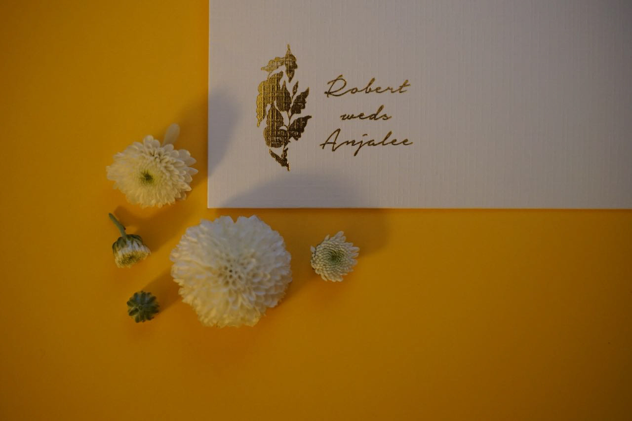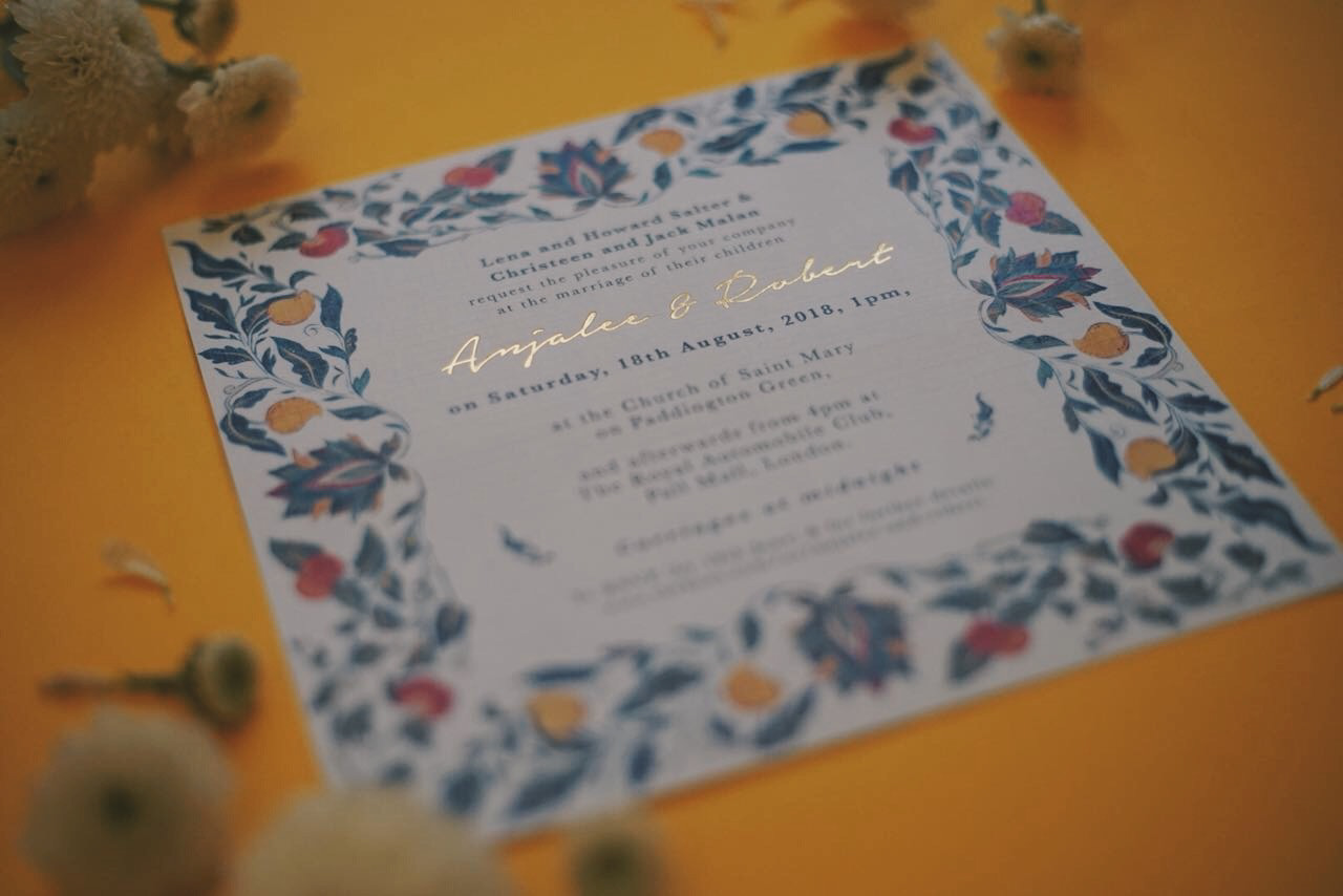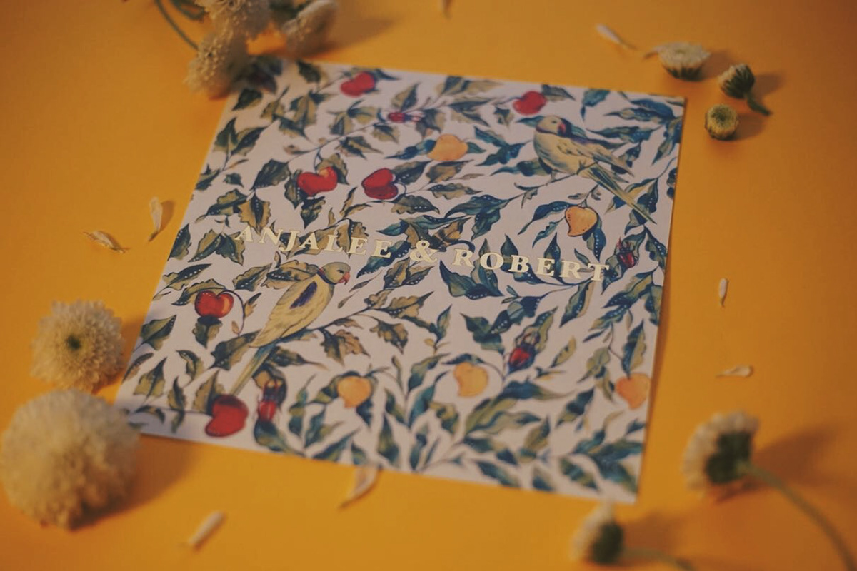 Apples, mangoes, parrots & beetles- gouache on paper, digitally printed on art paper with gold foil for Anjalee & Robert.